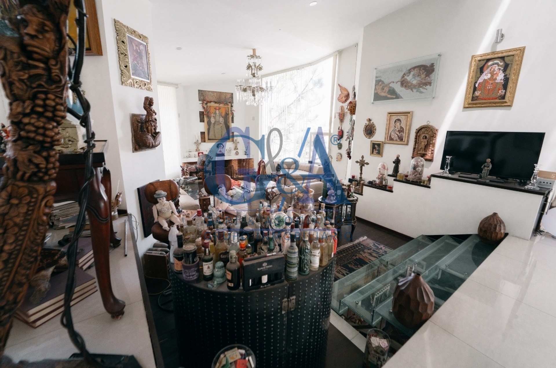 Recibidor, medio baño, Sala con Chimenea a